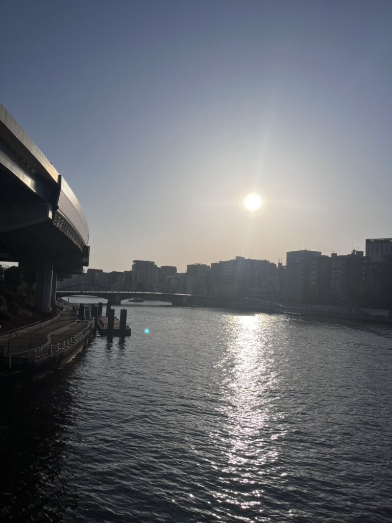 食後、夕暮れが近づく隅田川を歩きました。