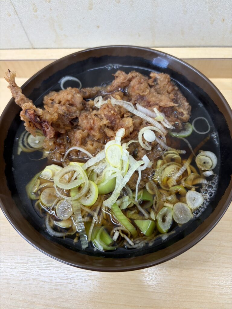 揚げたてのゲソ天をつゆにくぐらせれば、